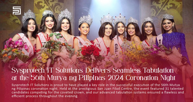 Sysprotech IT Solutions is proud to have played a key role in the successful execution of the 56th Mutya ng Pilipinas coronation night. Held at the prestigious San Juan Filoil Centre, the event featured 31 talented candidates competing for the coveted crown, and our advanced tabulation systems ensured a flawless and efficient process throughout the evening.